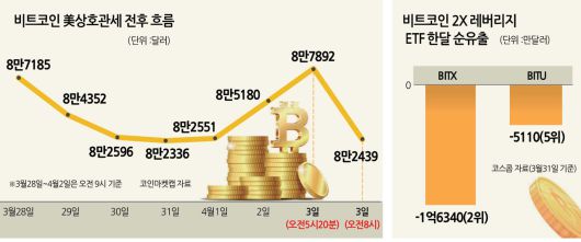 비트코인이 미국의 상호관세 발표로 불과 3시간 만에 8만8000달러 목전에서 8만2000달러대로 급락했다. 주요 알트코인(비트코인 이외 가상자산)도 5% 이상 하락세다. 위험자산 회피심리가 고조되면서 한 달새 비트코인 2배 레버리지 상장지수펀드(ETF)에서는 대규모 자금이 유출됐다.