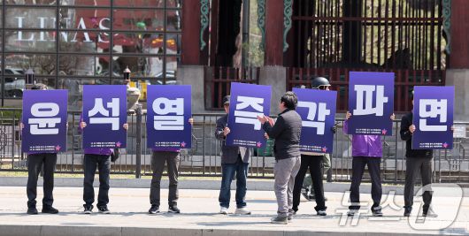 (서울=뉴스1) 김성진 기자 = 10.29 이태원 참사 유가족협의회 관계자들이 3일 서울 종로구 광화문광장 이순신 장군 동상 앞에서 윤석열 대통령 파면 촉구 피켓팅을 하고 있다. 2025.4.3/뉴스1
