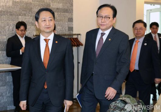 [서울=뉴스핌] 양윤모 기자 = 안덕근 산업통상자원부 장관과 정인교 산업부 통상교섭본부장이 3일 오전 대한상의에서 개최된 트럼프 미국 대통령의 "한국에 상호관세 25%"부과 발표에 대한 '민관 합동 美 관세조치 대책회의'에 참석하고 있다. 트럼프의 '관세 청구서'의 각국별 상호관세는 △한국 25% △베트남 46% △태국 36% △중국 34% △대만 32% △스위스 31% △인도 26% △일본 24% △유럽연합(EU) 20% △호주 10% △영국 10% 등으로 결정됐다. [공동취재] 2025.04.03 yym58@newspim.com |