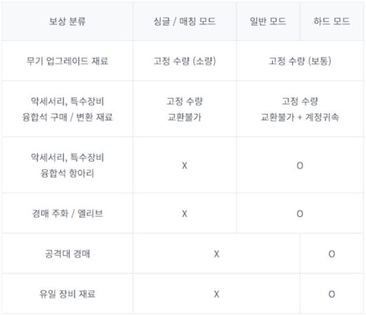 모드에 따른 파밍 보상은 일반과 하드 모드의 기본 파밍 보상 차이는 없으며 싱글과 매칭 모드는 더 낮은 파밍 보상이 제공된다. 또한 유일 장비는 강력한 성능과 특수 이펙트를 보유한 최강 아이템으로 서놉일 예정이다.