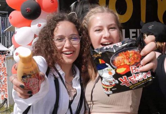 외국인들이 삼양식품 '붉달볶음면'과 '불닭소스'를 들어 보이고 있다. [사진=삼양식품] |