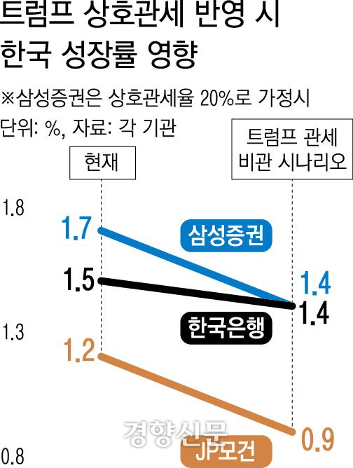 삼성증권은 1.4%까지 떨어질 것으로 내다봤다. 삼성증권은 지난 1일 미국이 20%의 상호관세를 부과한다면 올해 성장률이 기존 1.7%에서 1.4%로, 0.3%포인트 하락할 것이라는 전망을 내놨다. 정성태 삼성증권 수석연구위원은 통화에서“예상했던 것보다 상호관세율은 높아졌지만, 자동차에 추가로 관세를 부과하지 않기로 하면서 성장률 하락 폭은 0.3%포인트가 될 것으로 예상한다”고 했다.