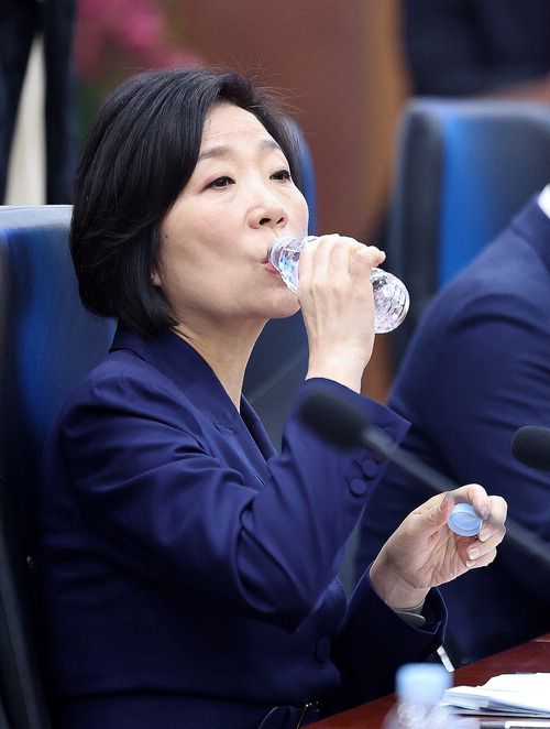 목타는 중기부 장관 오영주 중소벤처기업부 장관이 3일 서울 강남구 서울본부세관에서 열린 미국 관세 대응 수출 중소기업 현장 간담회에 앞서 물을 마시고 있다. 뉴스1 |