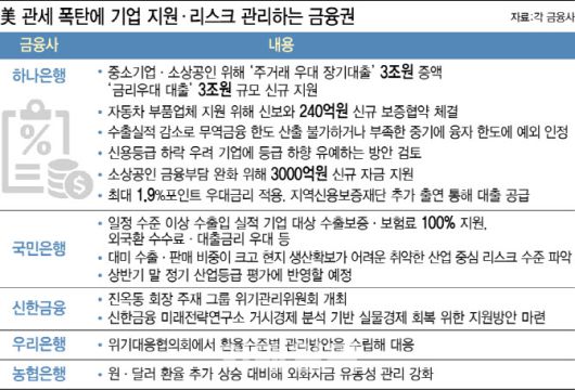 은행들은 관세 부과에 따른 리스크 관리에도 역량을 집중하고 있다. 국민은행은 대미 수출·판매 비중이 크고 현지 생산확보가 어려운 취약한 산업을 중심으로 리스크 수준을 파악 중이다. 국민은행 관계자는 “관세 부과 영향도를 고·중·저위험으로 분류해 모니터링하고 있다. 상대국과의 협상과정, 보복관세 부과 수준 등 추가적인 대응 결과를 반영해 올 상반기 말 정기 산업등급 평가에 반영할 예정이다”고 말했다.