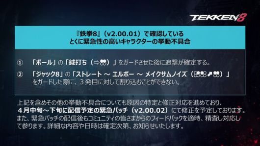 반다이남코는 3일 철권8 공식 SNS로 "현재 철권8에서 옵션 설정 불량, 일부 캐릭터의 거동 불량, 긴급성이 높은 현상의 수정 대응에 돌입했다. 이에 따라 4월 중하순에 긴급 패치를 전달할 예정이다"고 전했다.