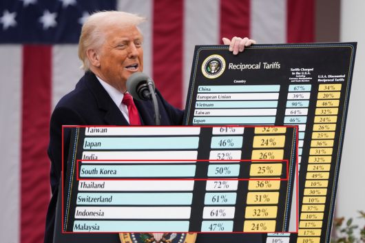 전날 도널드 트럼프 미국 대통령은 백악관 로즈가든에서 상호관세율을 발표하면서 한국의 상호관세율은 25%라고 발표했다. 당시 트럼프 대통령이 들고 있던 패널에도 한국의 관세율은 ‘25%’로 적혀 있었다.