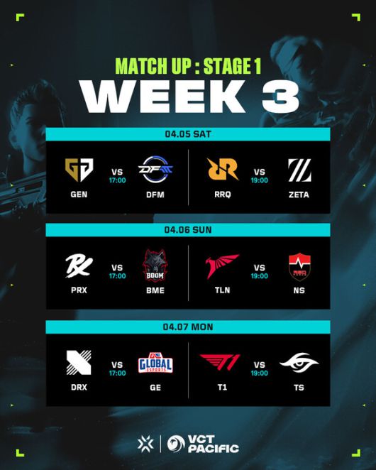 라이엇 게임즈는 4월 5일부터 7일까지 서울 상암 SOOP 콜로세움에서 열리는 VCT 퍼시픽 스테이지 1 3주 차 경기를 예고했다.