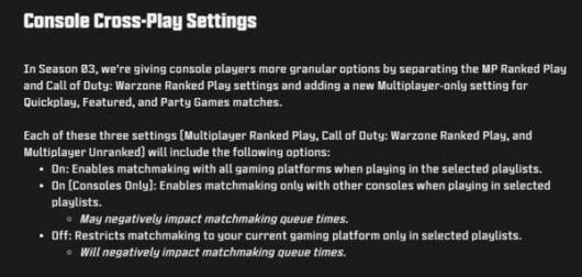 콘솔 전용 매치메이킹을 사용할 경우 선택한 플레이리스트에서 게임을 할 경우 PC를 제외한 콘솔 유저끼리만 매치메이킹 가능하다. 세부 옵션으로 현재 이용 중인 플랫폼의 유저만으로 제한시키는 것도 가능하다.