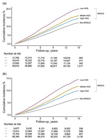 대사이상 지방간질환(MASLD) 환자의 악력에 따른 심혈관 질환 발생 위험을 분석한 결과, 남성(a)과 여성(b)에서 모두 대사이상 지방간이 없는 집단(Non-MASLD)에서 심혈관 질환 발생 위험이 낮았다. 그다음으로는 대사이상 지방간이 있는 집단 가운데 높은 악력(High HGS), 중간 악력(Middle HGS), 낮은 악력(Low HGS) 순으로 심혈관 질환 발생 위험이 커졌다. |