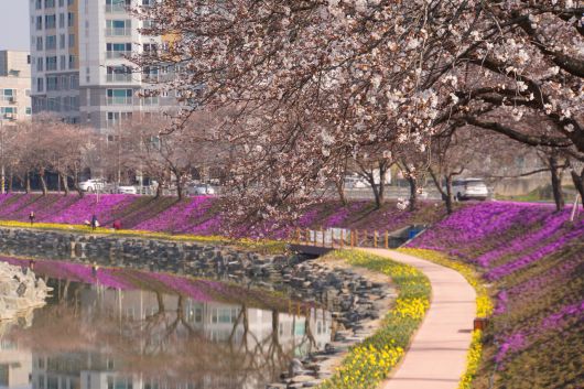 강변에 가장 가까운쪽은 수선화가 도열했고, 싱그러운 표정의 시민과 여행자의 산책길 옆 경사진 곳에는 분홍색 꽃잔디가 여행자의 마음을 상쾌하게 한다. 그리고 둑방에는 벚꽃 터널이 오가는 여행자들을 주인공처럼 의전해준다. 없던 정도 생길 판이다.