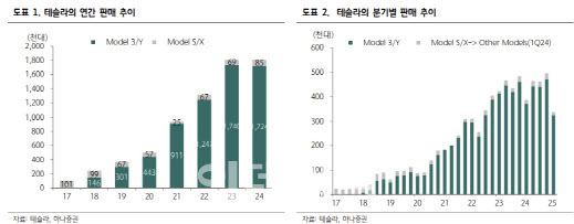 송선재 하나증권 연구원은 “테슬라의 1분기 판매는 2022년 상반기 이후 분기 기준 가장 낮은 수준이다”며 “판매 감소의 원인으로는 글로벌 전기차 시장의 경쟁심화, 신형 모델Y 출시 전 수요의 지연 및 공장 라인 교체에 따른 일시적 생산 중단, 그리고 CEO인 일론 머스크의 정치적 행보에 따른 구매자들의 반감 등이 복합적으로 영향을 미친 것으로 파악된다”고 분석했다.