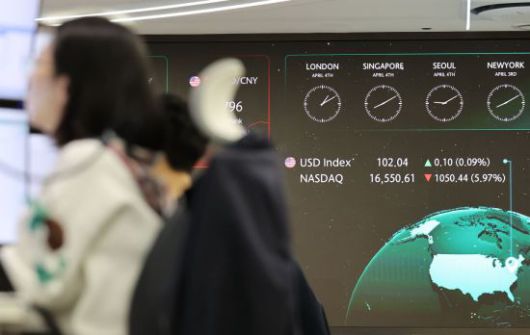 4일 서울 중구 하나은행 본점 딜링룸에 나스닥 지수가 표시되고 있다. 도널드 트럼프 미국 대통령의 상호관세 부과 발표의 여파로 미국 증시가 폭락했다. 2025.4.4 연합뉴스 |