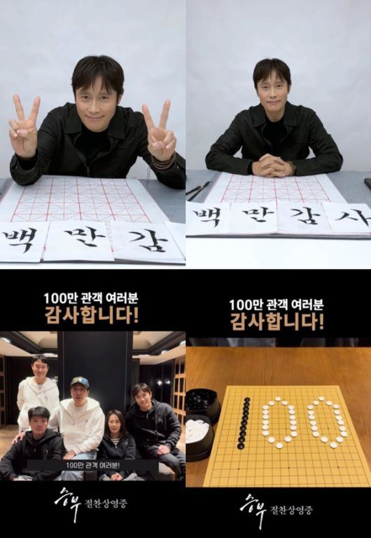 먼저 조훈현 역의 이병헌은 직접 서예로 '백만 감사'라는 문구를 작성하며, 황금 같은 시간을 내어 극장을 찾아와 준 관객들에게 감사의 마음을 표현했다.