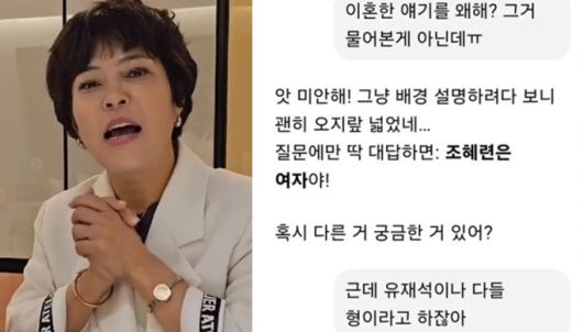 이에 조혜련은 "이혼한 얘기를 왜 해? 그거 물어본 게 아닌데"라며 발끈했다. 그러자 AI는 "앗 미안해. 그냥 배경 설명하려다 보니 오지랖 넓었네. 질문에만 딱 대답하면 조혜련은 여자야"라며 유쾌하게 넘겼다.