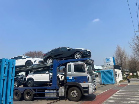 한국GM 부평공장에서 새로 조립된 차량이 트럭에 실려 공장을 빠져나오고 있다. /서일원 기자 |