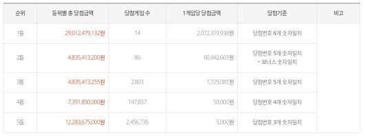 당첨 번호 4개를 맞힌 4등(고정 당첨금 5만원)은 147,837명, 당첨 번호 3개가 일치한 5등(고정 당첨금 5000원)은 2,456,735명이다.