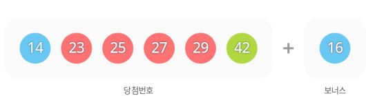 이번 추첨에서 당첨번호 '14, 23, 25, 27, 29, 42'와 보너스번호 '16'가 추첨됐다.