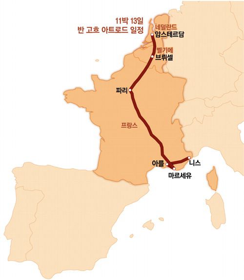 8일 차 코스가 압권이다. 반 고흐가 생을 보낸 마지막 장소 오베르쉬르우아즈를 찍는다. 투어 코스는 말년 작품과 생을 마감하기까지의 과정을 그대로 답습한다. 권총으로 자살을 시도한, 그 쓸쓸한 밀밭. 마지막 열정과 슬픔이 뒤섞인 교회. 마지막으로 그가 숨을 거둔 작고 소박한 방 오베르주 라부까지 두루 둘러본다. 반 고흐의 무덤 옆에는 평생 반 고흐를 뒷바라지한 동생 테오의 무덤이 나란히 놓여 있다. 대미를 장식하는 날은 12일 차 여행이다. 암스테르담 반 고흐 미술관으로 향한다. 테오의 미망인 요한나가 죽고, 아들 빈센튼 빌렘 반 고흐에게 상속된 작품들이 전시된 곳이다. 1925년부터 암스테르담 시립 미술관에 대여된 뒤 오늘에 이른다. 반 고흐 아트로드의 방점을 찍는 이곳은 1962년 반 고흐 재단이 창립된 후 약 10년이 지난 1973년에 완공됐다고 알려져 있다. 반 고흐의 대표작인 '해바라기'와 '자화상'을 비롯해 '까마귀가 있는 밀밭' 등 유화 작품 200여 점과 소묘 작품 500여 점을 감상한다.