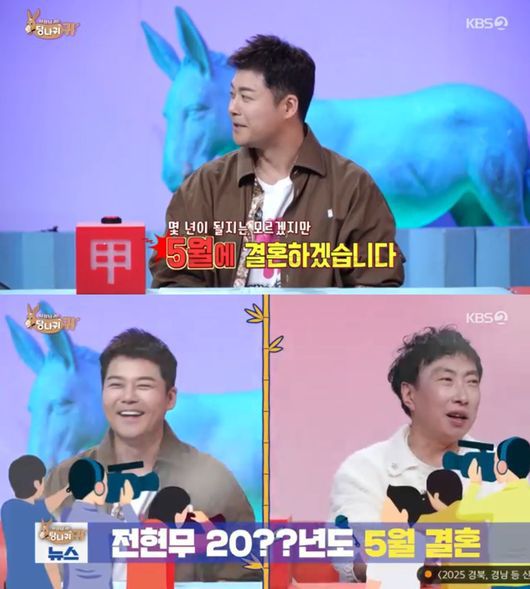 특히 박명수는 "현무가 5월에 결혼한다고 하던데"라고 언급하자 전현무는 “몇 년이 될지는 모르겠지만, 결혼은 5월에 하겠다”라고 체념하듯 결혼 예정 달부터 확정했다.