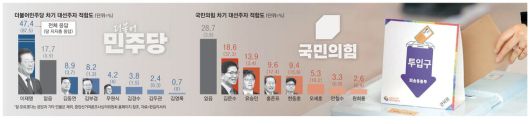 주요 정당의 대선후보 적합도 조사에는 정치 양극화의 현실이 담겨 있었다. 더불어민주당 후보로 누가 적합하냐는 질문에 이재명 대표가 선두에 오르긴 했으나 절반에 못 미치는 성적표를 받아 들었다. 국민의힘에선 여전히 1위를 달리고 있는 김문수 고용노동부 장관에 이어 유승민 전 의원이 예상을 깨고 2위에 오르며 약진했다.