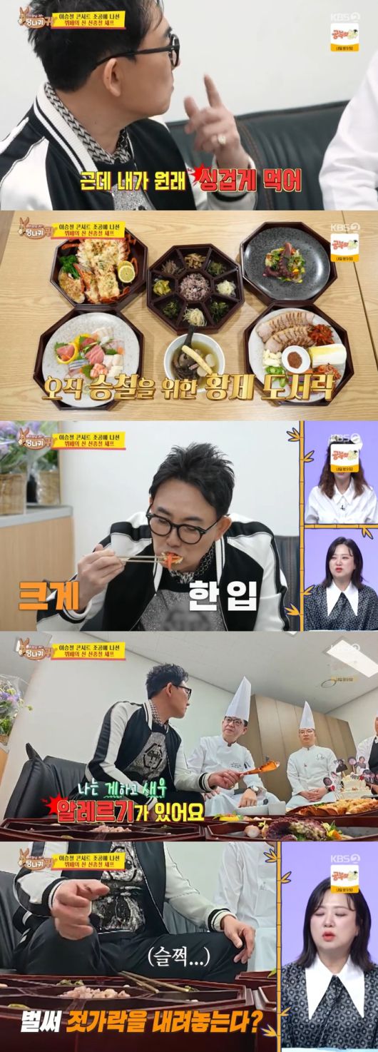 다음으로 랍스터까지 체크, “나는 게하고 새우 알레르기가 있어요. 평생 꽃게를 못 먹는다는 생각에 열 받아서 계속 먹으니까 되더라고. 공연 때는 물밖에 안 먹어”라며 젓가락을 내려놓았다.
