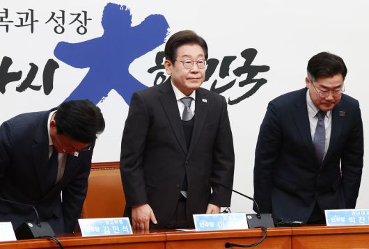 이재명 더불어민주당 대표가 4일 서울 여의도 국회에서 헌법재판소의 윤석열 대통령 파면 결정에 대한 입장을 밝힌 뒤 인사하고 있다. 오른쪽부터 박찬대 원내대표, 이 대표, 김민석 최고위원. 2024.4.4 뉴스1 |
