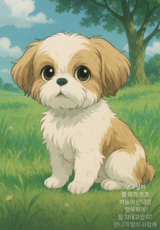 공개된 사진은 김윤지가 지브리 감성으로 반려견 사진을 바꾼 모습. 김윤지는 "보고싶어 울 아가 코코 하늘이 언니랑 행복하게 잘 지내고 있지? 언니가 많이 사랑해"라는 글을 남기며 안타깝게도, 세상을 떠난 반려견을 그리워해 지켜보는 이들까지 먹먹하게 했다.