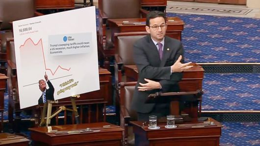 경제의 바로미터인 증시가 요동치면서 미국 정치권에서도 관세 전쟁에 대한 비판이 거세지고 있다. 브라이언 샤츠 민주당 상원의원(하와이)은 4일 열린 상원 예산안 토론에서 “수직 낙하한 미 증시 그래프만큼이나 내게 큰 충격을 준 장면이 있다”며 양팔을 교차해 악수를 하는 자세를 취했다. 안덕근 산업통상자원부 장관과 왕원타오 중국 상무부장, 무토 요지 일본 경제산업상이 지난달 30일 서울에서 만나 5년 만에 한중일 경제통상 장관회의를 가지며 악수한 자세를 흉내낸 것이다. 그는 “놀랍게도 벌써 우리의 동맹과 적국이 트럼프에 맞서 협력할 가능성을 검토하고 있다”며 “해외 지도자들이 트럼프의 괴롭힘에 당하고만 있지 않을 것”이라고 했다.