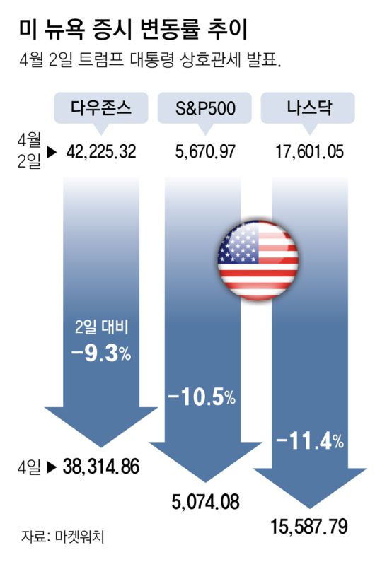 4일 미 증시에서는 전날에 이어 또 한 번 뉴욕 증시 3대 지수가 일제히 폭락했다. 이로 인해 이틀 새 6조6000억 달러(약 9646조 원)가 증발했다. 이틀 동안 스탠더드앤드푸어스(S&P) 500지수는 10.5%, 다우존스30 산업평균지수는 9.3%, 기술 중심의 나스닥지수는 11.4% 폭락했다. 특히 나스닥 하락 폭은 최고점 대비 22.7%에 달한다.