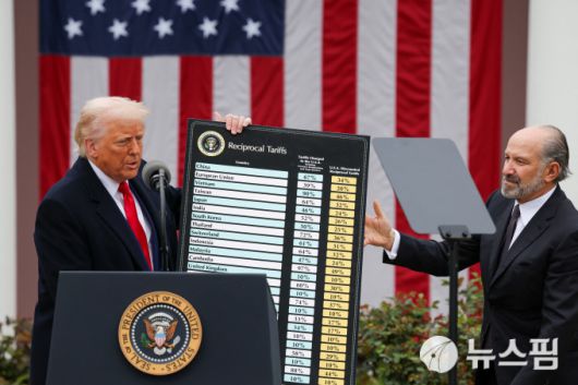 도널드 트럼프 미국 대통령이 지난 2일(현지시간) 백악관 로즈가든에서 상호관세를 발표하고 있는 가운데 하워드 러트닉 상무장관이 관세율을 적은 표를 트럼프 대통령에게 전달했다.[사진=로이터 뉴스핌] |