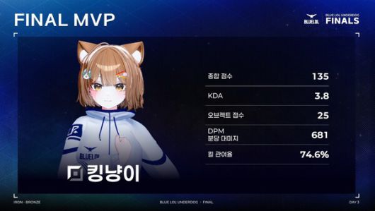 탑 채은채, 정글 디임, 미드 해이, 원딜 해나땅, 서포터 빙밍으로 구성된 팀 A와 탑 킹냥이, 정글 한세긴, 미드 아이코, 원딜 김웰로, 서포터 강희또로 구성된 팀 B가 블루롤 최강을 놓고 겨뤘다.