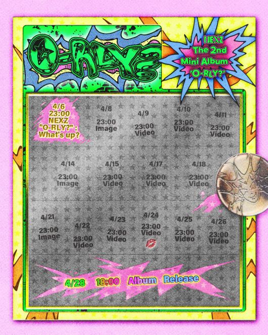 함께 공개된 타임테이블은 키치한 일러스트와 로고가 시선을 붙잡는다. 이들은 6일 'NEXZ "O-RLY?" : What's up?'을 시작으로 8일, 14일, 21일 이미지, 9일~11일, 15일~18일, 22일~26일 무제의 비디오를 순차 오픈하고 컴백 분위기를 예열한다. 특히 24일에는 비디오 예고와 함께 의문의 입술 이미지가 자리해 궁금증을 키운다.