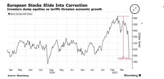범유럽 지수인 스톡스600 지수는 지난 4일 하락, 코로나 팬데믹(감염병 대유행)이 시작된 이래 가장 큰 주간 손실을 기록했다. 트럼프발(發) 무역전쟁이 세계 경제 성장에 타격을 입히고, 소비자 수요를 억제할 것이라는 우려로 시장이 조정 국면에 접어든 탓이다.
