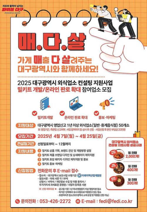 모집 대상은 대구지역에서 1년 이상 영업한 외식업소다. 밀키트 상품 개발, 온라인 판로개척에 의지가 높은 일반 및 휴게 음식점 영업주이면 누구나 신청할 수 있다. 단 식품위생법 위반으로 1년 이내 영업정지 이상을 받은 업소나 프랜차이즈, 유사사업 참여업소는 제외된다. 모집기간은 오는 25일까지다.