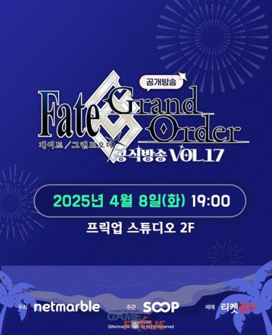 서울시 강남구 프릭업 스튜디오에서 진행되는 페이트/그랜드 오더의 공개 방송에서는 4월 업데이트 예정인 캠페인과 이벤트에 대한 소개와 다양한 현장 이벤트 및 운영진과의 Q&A가 진행될 예정이다.