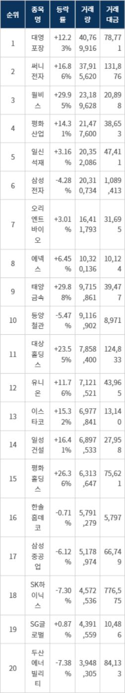 윌비스(008600)는 972원으로 29.95%의 상한가를 기록하며, 거래량은 2,318만주에 달한다. 평화산업(090080)은 1,829원으로 14.31% 상승하며, 일신석재(007110)는 2,285원으로 3.16% 상승하고 있다. 삼성전자(005930)는 5.47% 하락한 53,700원으로 거래량 2,031만주를 기록하고 있으며, 오리엔트바이오(002630)는 1,918원으로 3.01% 상승하고 있다. 에넥스(011090)는 941원으로 6.45% 상승했으며, 태양금속(004100)은 4,390원으로 29.88% 급등하고 있다. 동양철관(008970)은 1,002원으로 5.47% 하락하며 거래량 911만주를 기록하고 있다.