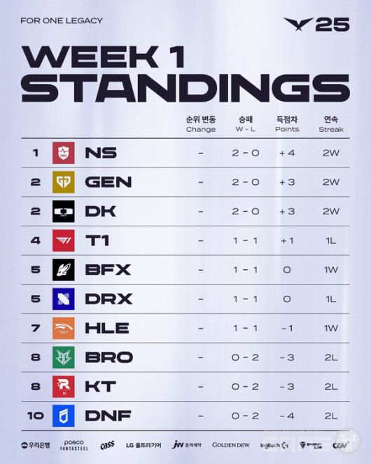 2025 LCK 정규 시즌 1주 차 팀 순위 /LCK |