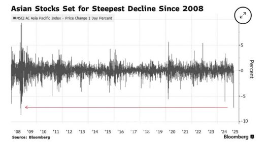 7일 블룸버그통신에 따르면 모건스탠리캐피털인터내셔널(MSCI) 아시아·태평양 지수는 한때 전장보다 7.9% 하락하며 2008년 10월 이후 가장 큰 낙폭을 기록했다.