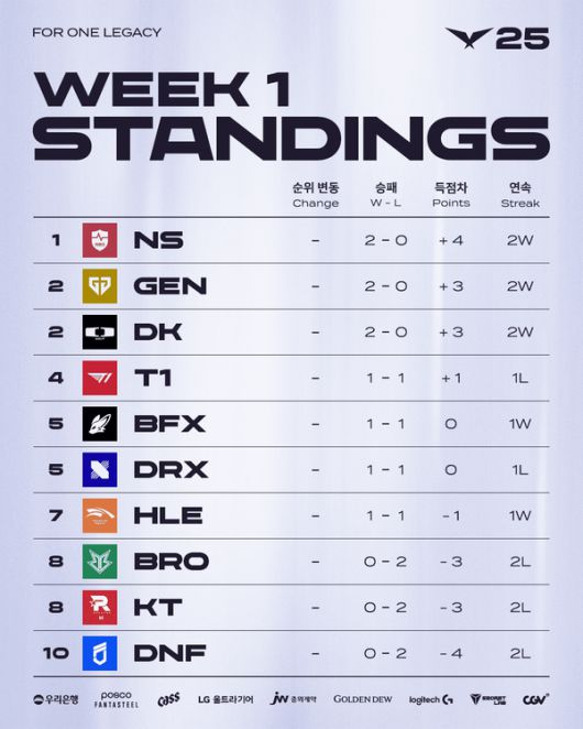 젠지가 퍼스트 스탠드 우승팀인 한화생명e스포츠와 2024년 LoL 월드 챔피언십을 차지한 T1을 연파하면서 개막 주차에서 최고의 성적을 냈다.