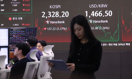 블랙먼데이 7일 서울 중구 하나은행 딜링룸 전광판에 코스피 지수와 원·달러 환율이 표시되고 있다. 미국발 관세 전쟁의 충격으로 이날 코스피 지수는 전 거래일보다 137.22포인트(5.57%) 급락한 2328.20을 기록하며 52주 최저치를 경신했다. 환율은 직전 거래일 주간거래 종가보다 33.7원 오른 1467.8원에 주간거래를 마쳤다. 5년여 만에 최대 오름폭이다. 외국인들은 이날 코스피에서만 2조957억원이 넘는 매도 물량을 쏟아냈다. 남정탁 기자 |