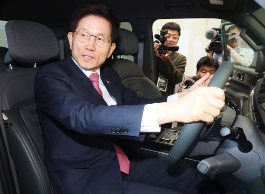 김문수 고용노동부 장관이 7일 경기도 용인시 기아 오산교육센터에서 열린 ‘전기차 정비인력 양성을 위한 업무협약식’에서 전시된 차량을 살펴보고 있다. 연합뉴스 |