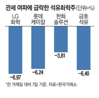한국거래소에 따르면 7일 LG화학은 전 거래일 대비 6.97% 떨어진 21만3500원에 장을 마감했다. 롯데케미칼은 6.24% 내린 5만7100원에 거래를 마쳤다. 금호석유(-6.40%), 한화솔루션(-3.81%)도 동반 하락하며 국내 대표 석유화학 4개사가 모두 약세를 보였다.
