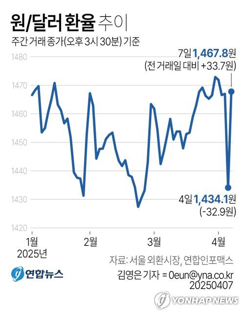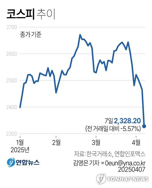 (서울=연합뉴스) 민경락 민선희 기자 = 미국 관세 충격에 7일 금융시장이 크게 요동치며 두달간 리더십 공백기 앞둔 한국 경제를 둘러싸고 불안감이 확대됐다.