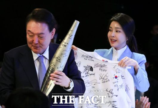 윤석열 전 대통령의 파면으로 영부인의 지위를 잃은 김건희 여사를 향한 수사가 윤곽을 드러내고 있다. 윤석열 전 대통령과 부인 김건희 여사가 지난해 8월22일 서울 한 호텔에서 열린 2024 파리올림픽 선수단 격려 행사 중 마술사 이은결의 공연에서 탁구 전지희로부터 선수단 사인 성화봉과 티셔츠를 선물 받고 있다. /뉴시스 |