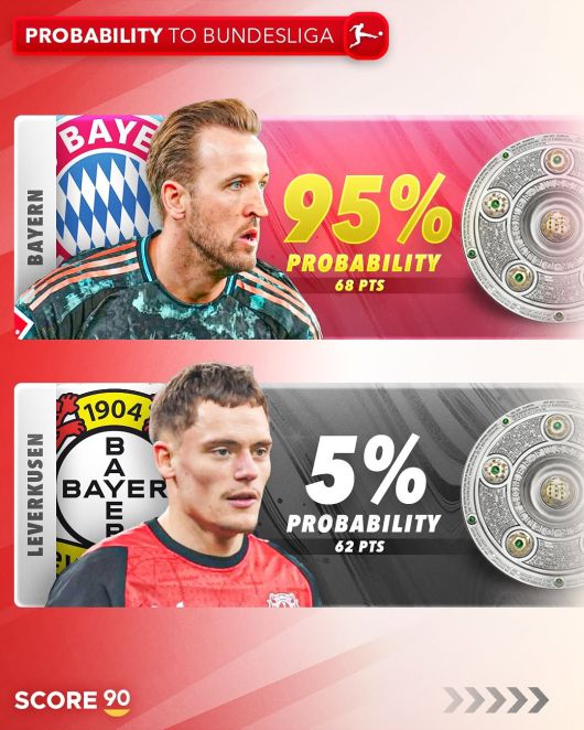 그러나 '스코어90'은 뮌헨이 레버쿠젠에 역전 우승을 허용할 가능성은 단 5%에 불과하다고 예상했다. 뮌헨이 우승을 차지할 확률을 95%로 내다본 것이다.