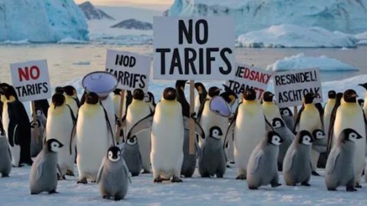 관세 폭탄 조롱 ‘펭귄 밈’ 확산 남극 일대의 펭귄들이 ‘관세 반대’ 피켓을 든 합성 이미지. 도널드 트럼프 2기 미국 행정부가 남극과 가까운 호주의 외딴 무인도 ‘허드맥도널드’ 섬에도 관세를 부과하자 이곳의 펭귄들조차 관세를 조롱한다는 ‘밈(meme·인터넷 유행 콘텐츠)’이 온라인에 등장했다. 사진 출처 ‘X’ |