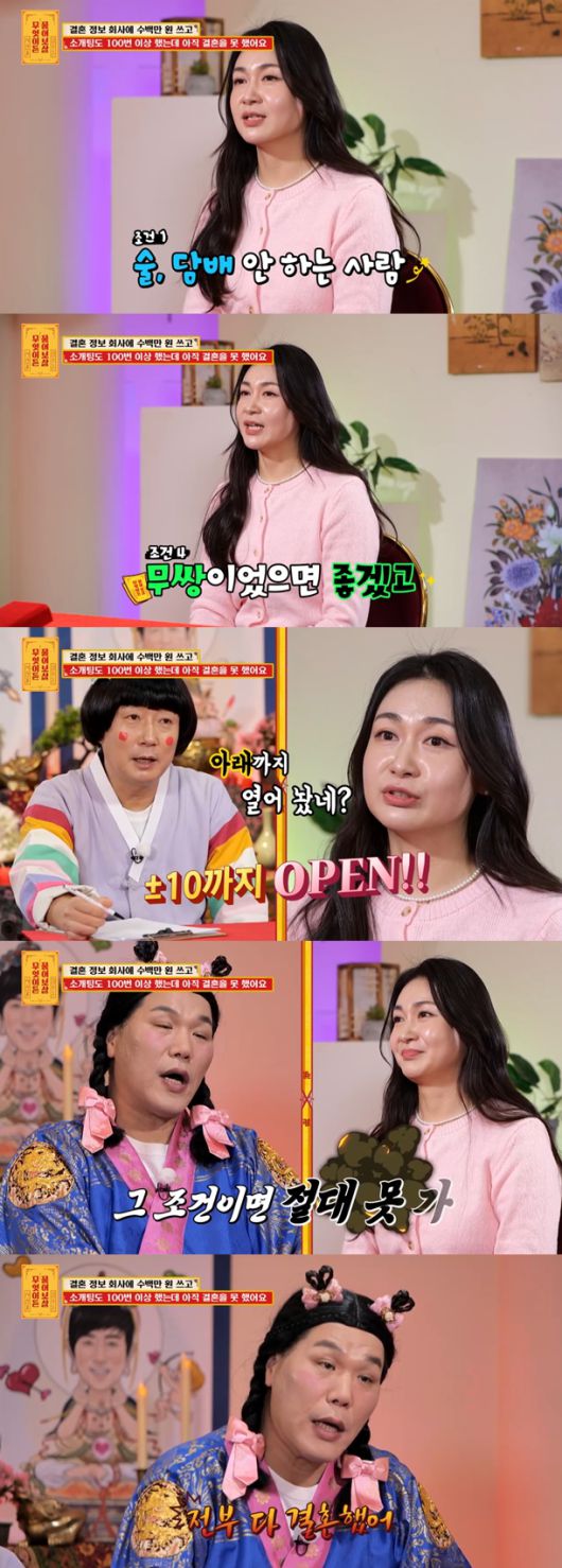 7일 방송된 KBS Joy '무엇이든 물어보살'(이하 물어보살)에는 결혼정보회사에 수백만 원을 쓰고 소개팅을 100번 이상했는데 결혼을 못 한 40대 사연자가 등장했다.