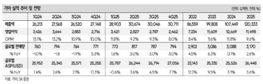 매출액은 글로벌 판매량이 전년 동기 대비 1.6% 증가하고 환율이 9.3% 상승하며 양호한 실적을 예상했다. 영업이익은 높은 환율 레벨(올 1분기 평균 원달러 환율 1451원)과 미국 판매 호조로 최근 수요 부진과 인센티브 상승에도 영업이익률 11.8%의 양호한 실적이 예상했다.