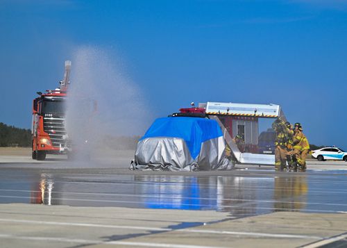 소방차는 이동 중 방수가 가능한 항공기 구조 소방차, 험지에서도 화재진압에 어려움이 없는 펌프차를 포함해 총 5대를 동원했다.