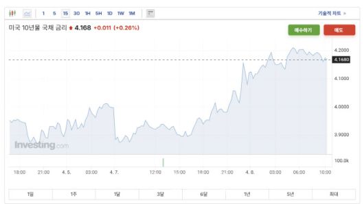 [이데일리 양지윤 기자] 미국 국채금리가 장기물을 중심으로 급등(채권 가격 급락)했다. 30년만기, 10년만기 국채의 매도세가 활발해져 금리가 급격히 상승했다. 시장 일각에선 도널드 트럼프 대통령의 관세 폭탄에 보복 차원에서 중국이 미 국채 매각에 나섰을 가능성에 무게를 두고 있다.